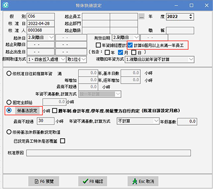(四) 員工特別休假日計算:新增計算6個月以上未滿一年員工勾選,及勞基法設定按鍵,系統自動依到職日計算特休之天數及有效日期